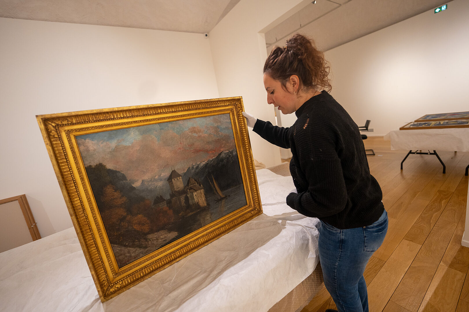Léa Henry tient un tableau de Gustave Courbet, Le château de Chillon, 1874, huile sur toile, n° inv A.33, pièce majeure des Beaux-Arts. L’œuvre revient d’un atelier de restauration après un long travail sur les craquelures et le vernis jauni. Ce tableau avait été confie a une restauratrice avec le soutien de la Direction régionale des affaires culturelles (DRAC).